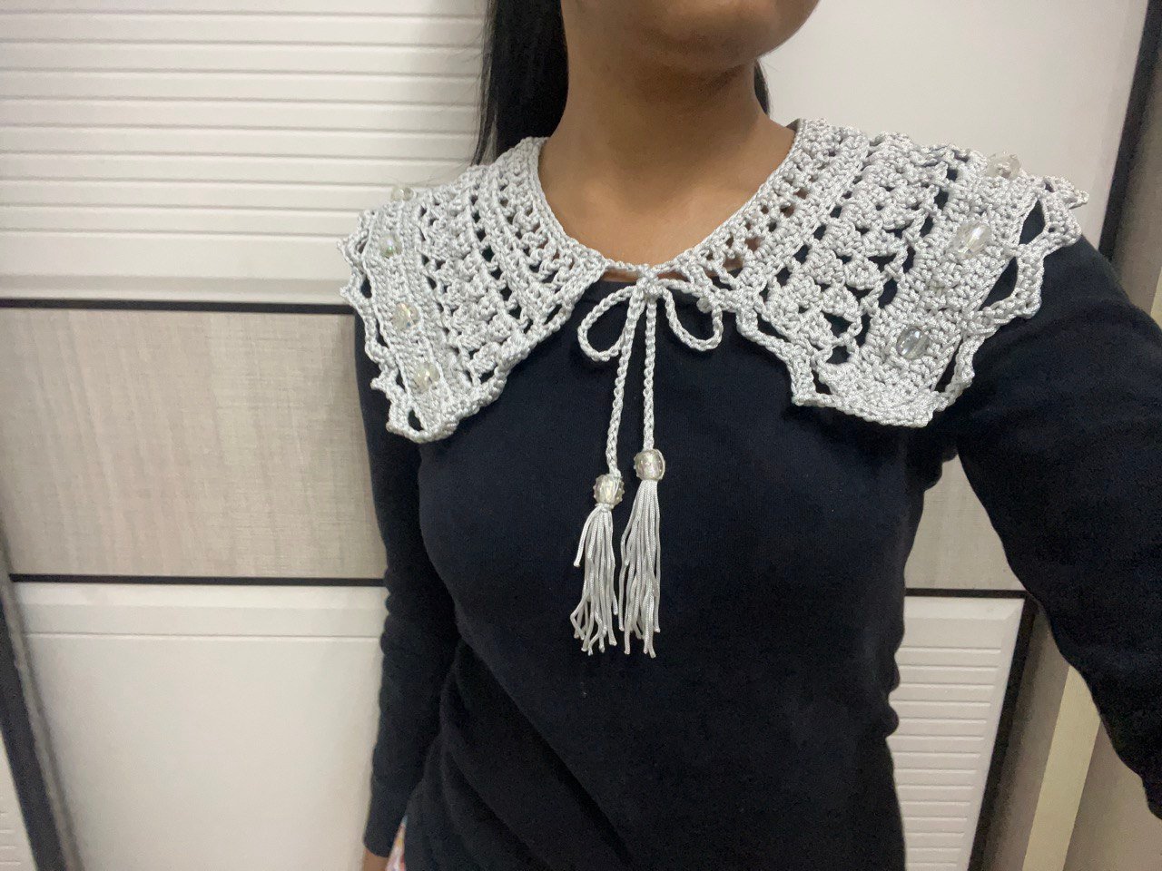 Metallic silver poncho with adjustable strings and tassels
